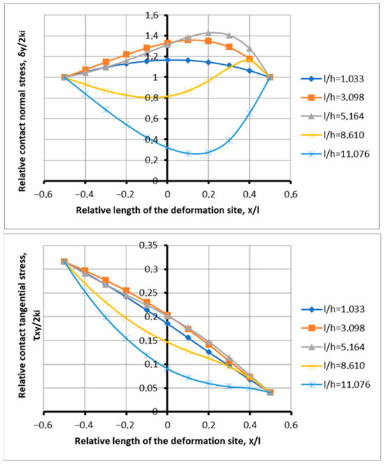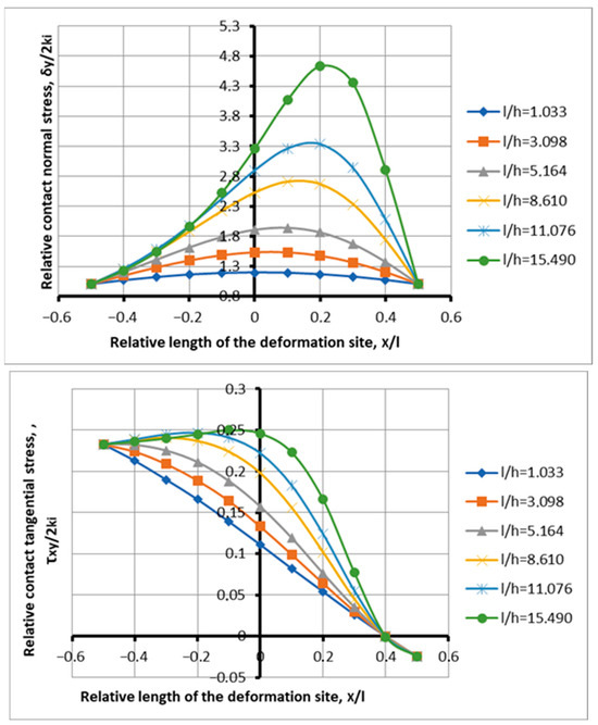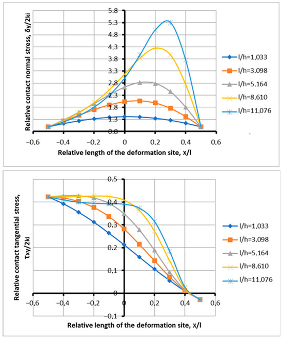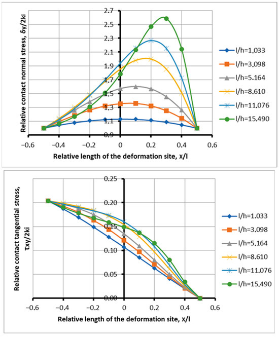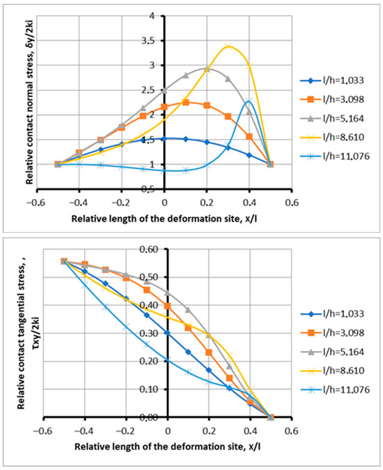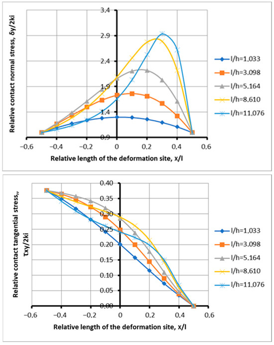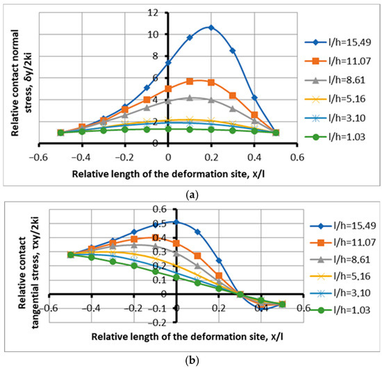 Distribution of contact stresses along the length of the deformation site depending on the shape factor at l/h = 1.03–15.49; α = 0.077; and f = 0.3: (a) distribution of normal stresses; (b) distribution of tangential stresses.
