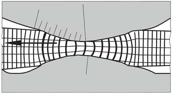 At the same time, there is no data on relative normal stresses of less than unity, especially for thin bands with a shape factor of 11.07. For this shape factor, the following loading parameters occur along the length of the hearth: 1.0; 6.751; 5.401; 3.374; 2.374; 1.874; 1.591; 1.404; 1.260; 1.131; and 1.0. Consequently, unlike Table 1, plastic deformation is carried out at all points of the deformation site, i.e., the rolling process is stable. This is a feature of this defining process, as for the processes in Figure 6 and Figure 9. In this case, the direction of avoiding rolling with the maximum deformation focus, which was indicated in Figure 10 and Table 1, was determined in the direction of increasing the stability of the plastic forming regime.