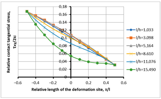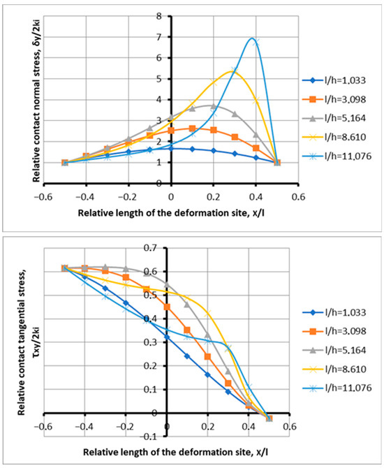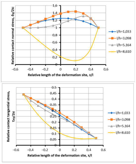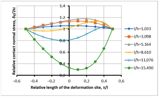 The relative contact-specific pressures were calculated using formulas (28). Figure 1 shows the stress distribution along the length of the deformation site depending on the shape factor l/h, [1], which is awaiting its physical and theoretical substantiation.