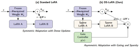 Our proposed DS-LoRA enhances standard LoRA by introducing two key mechanisms designed to foster a more asymmetric and input-sensitive adaptation: (1) an input-dependent gating mechanism to dynamically control the influence of each LoRA module, leading to input-level asymmetry, and (2) L1 regularization to promote sparsity within the LoRA matrices A and B, resulting in parameter-level asymmetry. To provide a clearer picture of our method’s architectural innovations, Figure 1 visually contrasts the data flow in a standard LoRA layer with that of our proposed DS-LoRA layer, highlighting the introduction of the dynamic gate and the use of sparse update matrices.