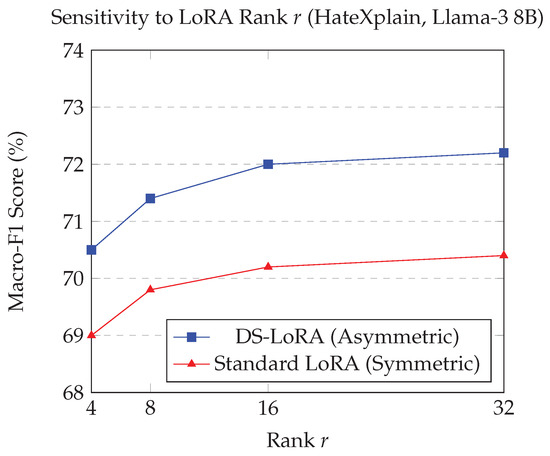 Macro-F1 score vs. LoRA rank r. DS-LoRA’s asymmetric adaptation consistently outperforms standard LoRA’s more symmetric approach across ranks on HateXplain (Llama-3 8B).