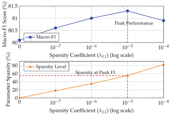 We analyze the effect of the L1 sparsity coefficient on DS-LoRA’s performance (Macro-F1, OLID, Llama-3 8B, ) and the resulting parameter-level asymmetry (sparsity level) in LoRA matrices.