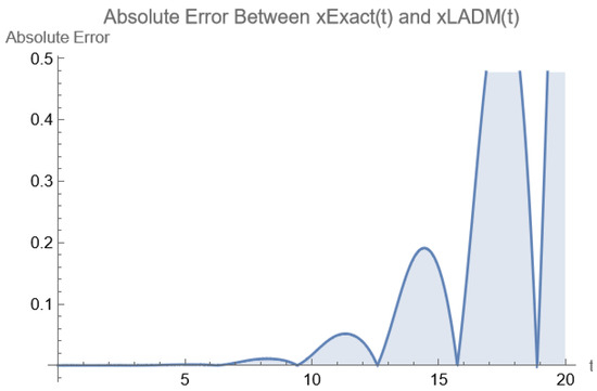 It is worth noting that the accuracy of the LADM solution may deteriorate over large time intervals due to series truncation. Nevertheless, for applications that require high precision over extended time intervals, incorporating additional terms—or applying techniques such as the Padé approximant to enhance convergence—could be a viable strategy to improve the accuracy of the solution.
