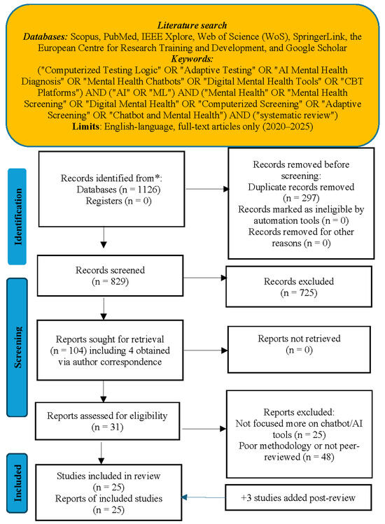 The search initially identified 1126 records. After removing 297 duplicates and automated exclusions using Mendeley, 829 records were screened by title and abstract. From these, 104 were selected for full-text review, of which 4 were obtained directly via author contact (email). After applying the initial inclusion criteria, 22 studies were identified. However, following peer-review feedback highlighting underrepresentation from the Global South, we conducted an additional targeted search. Three new eligible studies from Jordan, Brazil, and Malawi were identified and included in the final review, bringing the total to 25 peer-reviewed articles synthesized in this systematic review that were drawn from 7 scholarly databases: Web of Science (n = 6), PubMed (n = 11, including the three additional studies), SpringerLink (n = 2), Google Scholar (n = 3), IEEE Xplore (n = 1), Scopus (n = 1), and the European Centre for Research Training and Development—UK (n = 1). This count reflects both the breadth of sources searched and the multidisciplinary nature of AI-based mental health chatbot studies. Figure 1 illustrates a total of 25 studies that were screened through a systematic process. Two independent reviewers manually carried out the entire screening process to guarantee reliability.