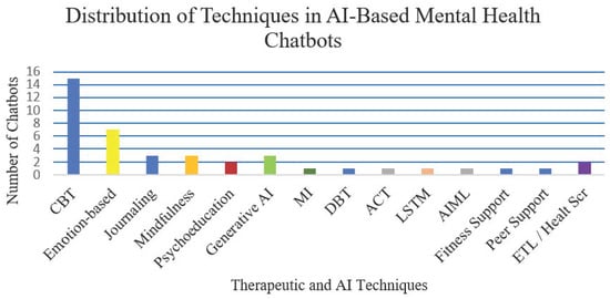 Frequency of techniques used in AI-based chatbots for mental health (2020–2025).