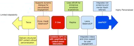 This figure illustrates the continuum of the reviewed chatbot platforms from low adaptability to high personalization and clinical integration. Rule-based platforms like Tessa provide structured CBT with no adaptive features, while Wysa, XiaoE, and BalanceUP provide dynamic NLP-based dialogues for enhanced personalization. More advanced platforms like F-One integrate generative AI (e.g., GPT-3.5 and LangChain) to facilitate context-sensitive emotional interaction. Replika enables multimodal interaction (AR/VR), and hybrid-integrated platforms like JomPrEP and Leora integrate risk screening, video material, and real-time crisis assistance with the highest level of personalization and system complexity.