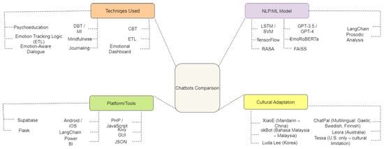 To better understand the design and functionality of AI-based mental health chatbots, a conceptual comparison was conducted. The following mind map (Figure 4) visually summarizes key components across four main dimensions: techniques used, platform/tools, NLP/ML models, and cultural adaptation.