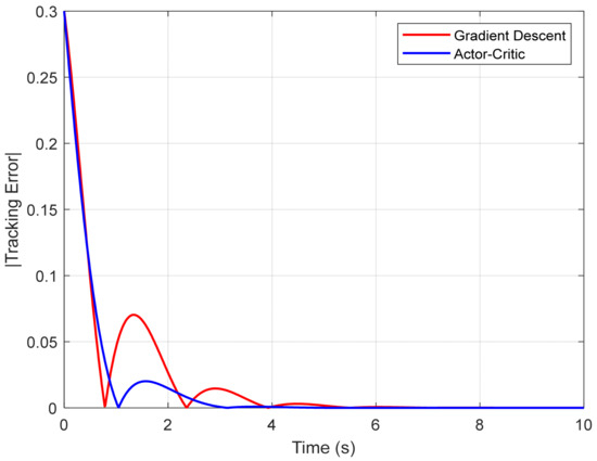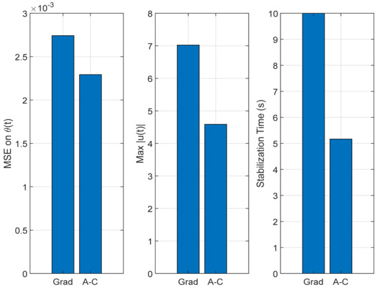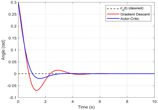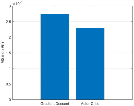 Figure 7 depicts the tracking mean squared error of the angle θ(t). It is evident that the Actor–Critic method significantly reduces the tracking error compared to the traditional approach, demonstrating improved accuracy in stabilizing the desired trajectory.