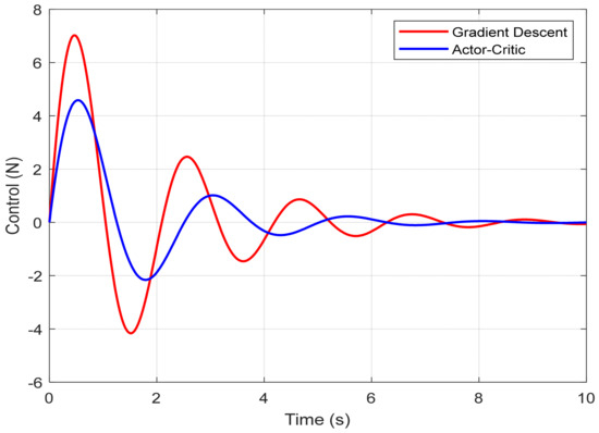 Control input comparison: Proposed Actor–Critic reinforcement learning method versus the gradient descent strategy from [14].