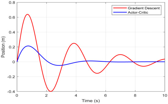 In Figure 6, the position of the cart x(t) is displayed over time. The cart displacement is better contained when using the Actor–Critic policy. The maximum lateral deviation of the cart is limited to approximately 0.55 m, compared to a more substantial swing of about 0.82 m observed with the gradient-descent-based control. This improved containment demonstrates the RL agent’s ability to better regulate the internal dynamics of the system while simultaneously stabilizing the output.