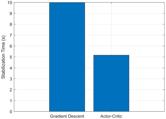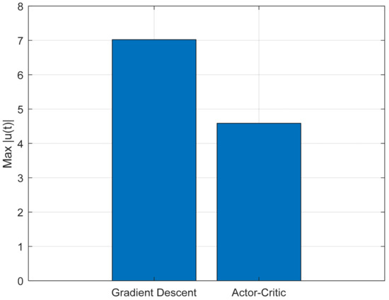 Figure 8 illustrates the maximum control effort ∣u(t)∣ produced by each method. The Actor–Critic algorithm generates a more moderate control signal, indicating a more efficient and energy-saving control action, which is advantageous for resource-constrained real-world systems.