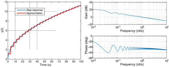 Comparison of the fractional integrator step response and the approximation (11) (left) and frequency response of the approximation (13) (right).