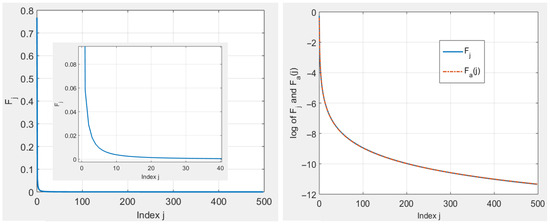 Evolution of the coefficients as a function of the index j (left) and comparison with function (relation (24)) with a logarithmic scale on the ordinate (right).