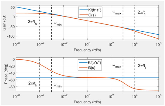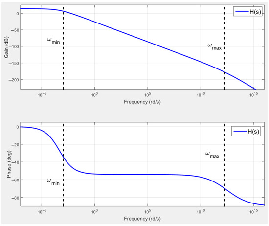 Clearly, the transfer function exhibits a fractional behavior within the frequency band defined by: