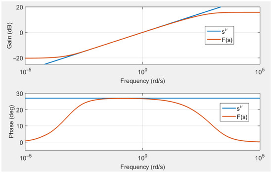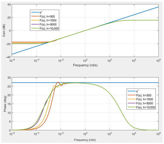 The frequency response of the transfer function given by relation (48) is represented by Figure 4 for , , , , and . It is compared to the frequency response of the transfer function . This figure clearly highlights that exhibits an order fractional derivative behavior between the frequencies and . Figure 5 evaluates the impact of parameter . For several values of , the gain and phase of the transfer function are represented. This figure gives the following rule to avoid gain and phase ripples: .