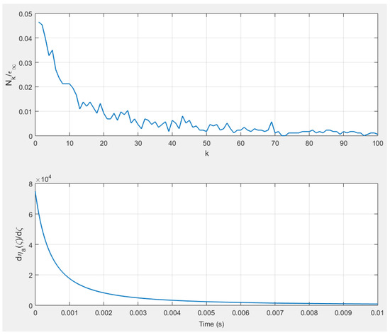 The analysis done is this section is based on the Grünwald–Letnikov definition given by relations (3) and (4). This definition also permits an interpretation concerning the distribution of delays caused by the operator . The Laplace transform of relation (3) leads to [33,34]