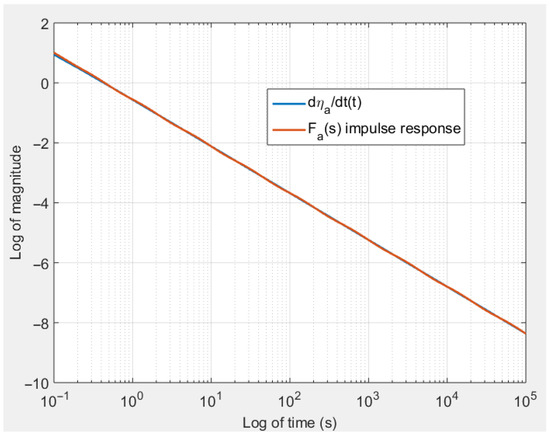 in order to well cover the time domain on which the RSA process is studied. Transfer function is computed using an optimization problem aiming at minimizing the error between the logarithm of the impulse response of and . As the resulting transfer function is of order 16 over 16, its coefficients are not given, but Figure 10 shows a comparison using a logarithmic scale on both the abscissa and ordinate and reveals a very good approximation.
