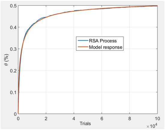 Mathematical and physical considerations are proposed in [45,46] to show the link of adsorption phenomenon with delay-based models. In order to illustrate even better the interest of distributed delay models to model RSA (and thus adsorption) phenomena and fractional behaviors, it is now proposed to use relation (54) to fit the kinetic shown by Figure 7. In this numerical application, parameters , , , and of model (54) are computed using a nonlinear Levenberg–Marquardt optimization algorithm that minimizes a quadratic criterion involving the error between the model output and the response . For the implementation of model (54), the Laplace transform of is approximated by a transfer function denoted , and the integral is treated as a convolution product. Model (55) can thus be implemented in Matlab Simulink software as shown by Figure 9. Note that the function can also be implemented using a FIR model but the simulations become time consuming. In future work, the author intends to develop more specific implementation solutions based on the discretization of the integral after a specific change in variable that contracts the time scale.