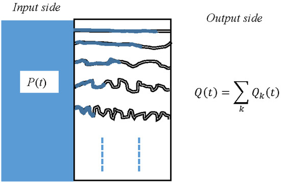 This interpretation is illustrated in Figure 12. It is assumed that the medium consists of channels of differing lengths. Prior to the introduction of water into the medium, these channels are considered to be devoid of fluid. When the fluid pressure is applied at the input side, it generates a flow within the channels, resulting in a total output flow denoted as , which is the aggregate of the flow generated by each individual channel, represented as :
