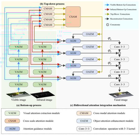 The human visual system exhibits remarkable capability in extracting critical features from complex scenes with high computational efficiency, which offers benefits in many visual tasks, such as visual question answering and image classification [35,36,37]. It has been proven that the visual attention can be divided into bottom-up and top-down processes [38]. On the one hand, bottom-up visual attention is driven by external visual stimuli, such as direction and intensity. Wang et al. [39] utilized bottom-up visual attention to obtain visual information during feature extraction. Liu et al. [20] proposed an improved ITTI visual attention model to extract intensity and directional features of source images. These methods demonstrate that bottom-up attention can obtain fused images with excellent visual perception. On the other hand, top-down visual attention can modulate the visual system’s responsiveness to different stimuli based on prior knowledge and experience of perceptual objects. This mechanism enables selective enhancement of object-relevant information while suppressing task-irrelevant distractors in complex scenes [40]. Fang et al. [41] utilized top-down attention to detect salient objects. Wang et al. [42] enhance the object semantics by top-down attention. These works demonstrate that top-down visual attention can effectively capture an object’s semantic information.