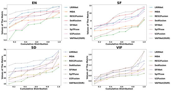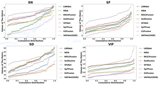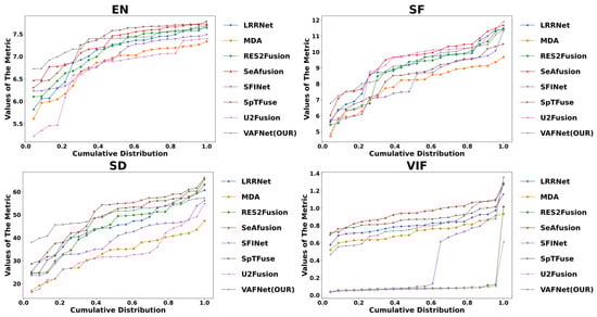 Quantitative comparison of EN, SF, SD, and VIF on 56 pairs of infrared and visible images from the MSRS dataset. The point on the curve indicates that the metric value of percent of image pairs does not exceed y.