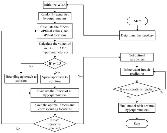 The whale optimization algorithm (WOA), proposed by S. Mirjalili in 2016, is a heuristic optimization technique inspired by the natural hunting behavior of whales. Compared to particle swarm optimization (PSO), Bayesian optimization (BO), and genetic algorithms (GAs), the WOA effectively preserves population diversity, mitigating the propensity of PSO and GAs to become trapped in local optima. Its mechanism exhibits low sensitivity to initial conditions and demonstrates remarkable stability. Moreover, the WOA excels in high-dimensional, multimodal, complex search spaces, outperforming BO. Consequently, this study adopts the WOA as the parameter optimization method. The complete mathematical formulation and operational principles of WOA are comprehensively detailed in the foundational work []. Its mathematical model is represented by Equation (11).