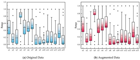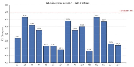 To quantitatively assess the distributional similarity between the original and augmented datasets, the KL divergence for each feature was calculated and illustrated as a bar chart (see Figure 4). All feature-wise KL divergence values were below 0.07, with the maximum value observed for X2/X12 (0.063) and the minimum for X11 (0.016), confirming that the augmented dataset preserves the statistical structure of the original data with minimal deviation. The low divergence across all 15 input dimensions further supports the effectiveness of the data augmentation strategy in maintaining feature-level distributional consistency.
