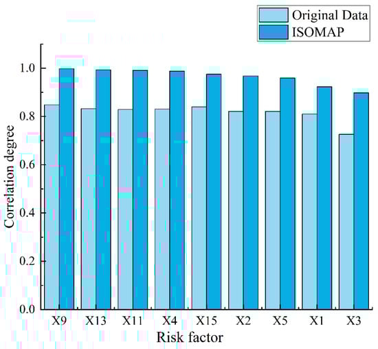 Using gray relational analysis, the correlations between the extracted features and the target factors were computed, as illustrated in Figure 6. The degree of association before and after dimensionality reduction indicates that the nine influencing factors post-reduction exhibit a maximum gray relational degree of 0.998 and a minimum of 0.726, with eight of these factors exceeding a correlation of 0.9. The top nine influencing factors exhibit relatively minor differences in correlation, stabilizing between 0.81 and 0.84. Overall, the gray relational degree between the influencing factors and the target factors demonstrated a significant increase after ISOMAP dimensionality reduction, with an average improvement of 14.9% over the pre-reduction values.