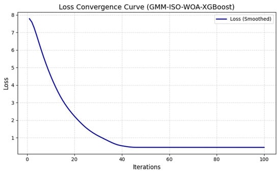 The nine-dimensional risk factors, after dimensionality reduction, were used as inputs, while the probability of mine water inrush was set as the output variable. The population size for the WOA was set to 20, with a decay factor of 0.5 and a maximum of 100 iterations, during which the parameters of the XGBoost model (learning rate = 0.1, tree depth = 6, reg_alpha = 0.3, reg_lambda = 1.2, etc.) were optimized to determine the best combination. To further illustrate the internal optimization mechanism of the proposed model, we plotted the convergence curve of the loss function during the training process. The convergence curve in Figure 7 clearly illustrates the effectiveness of the WOA in optimizing the XGBoost model’s hyperparameters. In the initial 20 iterations, the loss significantly decreased from approximately 7.8 to 2.1. This rapid descent shows that the optimization algorithm quickly identified promising regions within the hyperparameter search space. For instance, at iteration 40, the optimized parameters included a learning rate of 0.1, a maximum tree depth of 6, a reg_alpha of 0.3, and a reg_lambda of 1.2, yielding a training RMSE of about 0.33. Subsequently, the loss function gradually stabilized, with only marginal improvements observed after roughly 55 iterations. At this point, the hyperparameters had finely adjusted to a learning rate of 0.085, a reg_alpha of 0.28, and a reg_lambda of 1.15. This consistent trend demonstrates that the WOA effectively guided the search toward near-optimal hyperparameters, successfully avoiding local minima and ensuring the resulting model’s robustness.