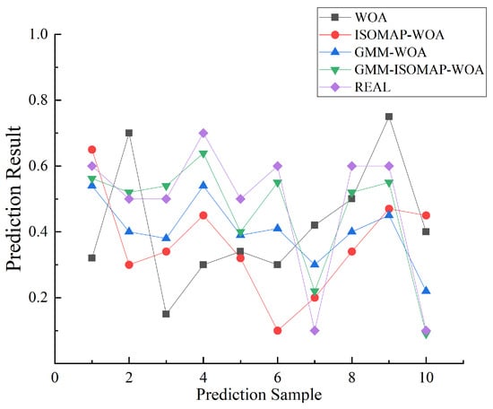Figure 8 visually compares the predicted probabilities of water inrush generated by four distinct XGBoost-integrated models—WOA (whale optimization algorithm), ISOMAP-WOA (isometric feature mapping-whale optimization algorithm), GMM-WOA (Gaussian mixture model-whale optimization algorithm), and GMM-ISOMAP-WOA (Gaussian mixture model–isometric feature mapping–whale optimization algorithm)—against the actual observed values. The figure clearly indicates that the WOA-XGBoost models without dimensionality reduction or data augmentation exhibit noticeable deviations from the true values. In stark contrast, the GMM-ISOMAP-WOA model, which incorporates both the Gaussian mixture model for data augmentation and ISOMAP for nonlinear dimensionality reduction, yields predictions that are remarkably closer to the ground truth across nearly all samples. This compelling result strongly confirms the advantage of integrating both Gaussian mixture models for enhancing input data quality and nonlinear dimensionality reduction via ISOMAP in significantly boosting the model’s generalization capability. The enhanced alignment between prediction and reality also supports the statistical performance results summarized in Table 4.