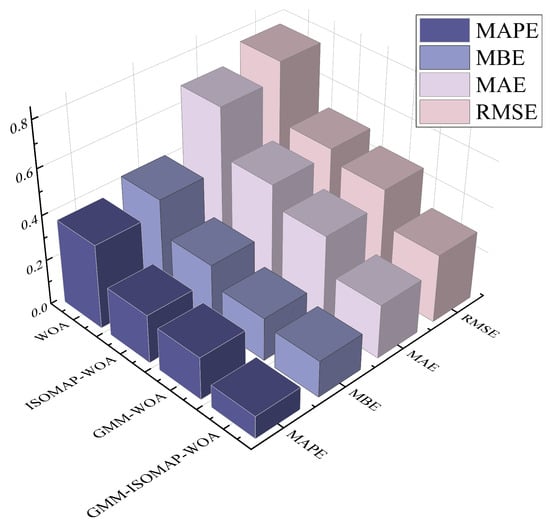 Figure 9 presents a comparison of the prediction results, illustrating that the water inrush prediction model based on data augmentation using ISOMAP-WOA-XGBoost significantly outperforms the other models. Table 4 outlines the performance metrics for each model, showing that the water inrush risk prediction model utilizing data augmentation achieved reductions in RMSE of 60.6%, 26.57%, and 19.90% compared to the results for the WOA-XGBoost model, the ISOMAP-WOA-XGBoost model without data augmentation, and the WOA-XGBoost model with data augmentation, respectively. In terms of MAPE, the reductions were 73.12%, 30.38%, and 3.24%; for MAE, the reductions amounted to 65.56%, 35.31%, and 22.58%; and for MBE, the reductions were 62.12%, 26.82%, and 6.82%. These results clearly demonstrate that the integration of a composite model with data augmentation facilitates the self-mining of associative information, thereby effectively improving sample distribution and enhancing sample diversity, which contributes to the accuracy and effectiveness of water inrush risk predictions. A critical aspect of this study is the rigorous comparison with KPCA-DBO-SVR, representing a robust approach combining nonlinear feature transformation with optimization. While KPCA-DBO-SVR shows improvement over a standalone SVR, our model significantly outperforms it for small sample, nonlinear water inrush probability prediction. First, our model incorporates GMM for data enhancement. In small, sparse datasets, GMM effectively models underlying probabilistic distributions, enriching feature representation crucial for robust learning. Second, our choice of ISOMAP for dimensionality reduction is pivotal. While KPCA transforms features, ISOMAP excels at manifold learning, preserving crucial intrinsic geometric structures in complex nonlinear data, providing a more discriminative input. Finally, the synergistic combination of WOA-optimized XGboost is powerful. XGboost, an inherently robust ensemble method, excels at nonlinear regression, even with limited data. When precisely tuned by WOA and fed with GMM and ISOMAP-enhanced features, it learns more precise patterns.