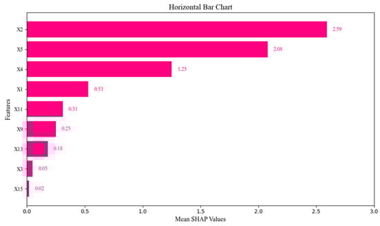 Utilizing SHAP’s global explanation tool, the average SHAP values for each feature across all samples were computed, resulting in a ranking of feature importance. Here, the global significance of each feature is represented by the average absolute value across all provided samples. In Figure 10, the x-axis denotes the average absolute SHAP values of the input parameters, while the y-axis reflects the importance ranking of each influencing factor. It is evident that the primary risk factors for water inrush in coal mining are aquifer water pressure (X2), depth of floor damage (X5), and aquiclude thickness (X4), which serve as core driving factors for water inrush predictions, with their contributions significantly surpassing those of other features, aligning closely with hydrogeological and mechanical principles. Specifically, groundwater pressure in the aquifer emerges as the foremost contributing feature, as it directly reflects the penetrating pressure of groundwater on the aquiclude, constituting a necessary condition for water inrush.