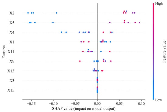 Among the features with moderate contributions, the working face inclined length (X1, SHAP = 0.53) and the mining depth (X11, SHAP = 0.31) reflect the engineering scale effects: longer working faces increase the extent of floor damage, while deeper mining enhances the coupling of geological stress and water pressure. Together, these factors indirectly affect the risk of water inrush by altering the distribution of the stress field. The low contribution of the working face strike length (X13, SHAP = 0.18) suggests that the sensitivity of the strike dimension to floor damage is lower than that of the dip dimension, aligning with the conclusion from numerical simulations that indicate a higher concentration of shear stress along the dip profile. Notably, the contribution of coal seam thickness (X15, SHAP = 0.02) and the exclusion of the coal seam dip angle (X14) are minimal, which may be attributed to the stability of the coal seam structure within the study area, or it could be that the mining height parameter (X9, SHAP = 0.25) has already captured its mechanical effects. Furthermore, the lithological combinations of the aquiclude (X6, X7, X8) did not appear among the high-contribution features, indicating that, within the current dataset, lithological differences are dominated by macro parameters such as thickness (X4) and water pressure (X2). Therefore, further examination through modeling of the mesoscopic fracture network is needed for deeper analysis.