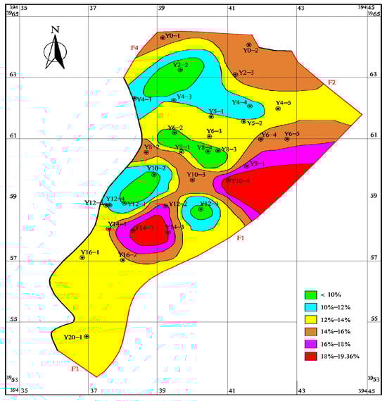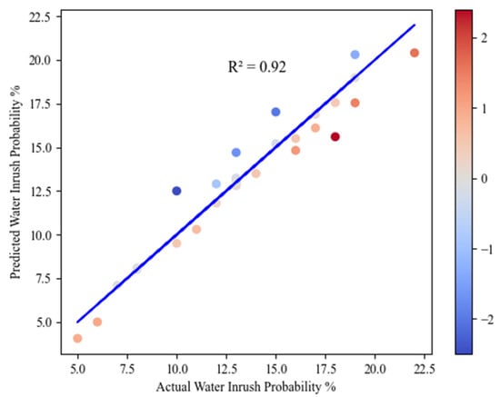 Given the production parameters from 30 drilling points at the working face in the study area—specifically the mining height, working face strike length, mining depth, coal seam thickness, groundwater pressure, and floor failure depth—a regression prediction model was constructed. Notably, there were three missing dependent variables compared to the number in the original training dataset. The aggregated data was then input into the model for regression predictions. The dataset reveals a good fit between the predicted values and the actual risk probabilities, as shown in Figure 12. Additionally, Figure 13 compares the water inrush hazard zoning of the Yangcheng Coal Mine. Based on the prediction results, the data-driven model established in this study demonstrates a strong adaptability to the varying hydrogeological conditions in coal mines. It effectively discriminates the prospective probabilities of water inrush risk, achieving a coefficient of determination (R2) greater than 0.9. This indicates that even in the presence of dimensional data deficiencies, the model exhibits remarkable generalization capabilities and precision in predictive performance.