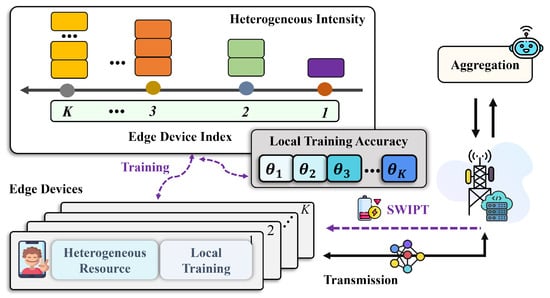 As shown in Table 1, we list the specific research content of some state-of-the-art works. Judging from the existing literature, most studies treat the design of local training intensity and wireless transmission strategies as two separate issues. However, we recognize that there may be a trade-off between local training and wireless communication. The underlying logic is that edge devices typically have a limited battery capacity (as seen in sensors), and this capacity must support both local training tasks and the transmission of model updates in uncontrollable wireless environments. In such cases, solely optimizing computation or wireless transmission strategies often leads the system to face a dilemma: if devices prioritize computation and allocate most of their energy to local training, they may lack sufficient residual energy to sustain wireless communication, resulting in more severe transmission distortions. Conversely, if they excessively reduce local training intensity to ensure wireless transmission quality, they may fail to maintain adequate model update quality, hindering the achievement of the desired global convergence accuracy. Against this backdrop, this paper makes efforts in two main areas. First, we consider applying simultaneous wireless information and power transfer (SWIPT) during the training process to provide wireless energy to these energy-constrained devices, thereby alleviating issues of inadequate training or wireless distortion caused by insufficient energy. The primary benefit of SWIPT is its ability to facilitate concurrent data transmission while also enabling wireless power transfer [24,25,26,27]. For example, the work in [26] proposed a integration technique that combines SWIPT, single-input–multiple-output, and non-orthogonal multiple access to enhance device connectivity and power supply for cell-edge sensors while also improving outage performance through a transmit antenna selection strategy for the base station. In [27], the authors proposed leveraging a hybrid approach that combines time-switching and power-splitting energy at the relay user equipment to minimize the outage probability as much as possible. The aforementioned studies validate the notion that SWIPT is particularly well suited to services that are both energy-intensive and latency-sensitive, which motivates us to apply it to FEEL. Second, under the constraints of limited energy budgets, we precisely characterize the synergistic impact of local training and wireless transmission on the overall performance of the system from a global perspective and design a joint optimization strategy that takes both into account. The key contributions of this paper can be outlined as follows: