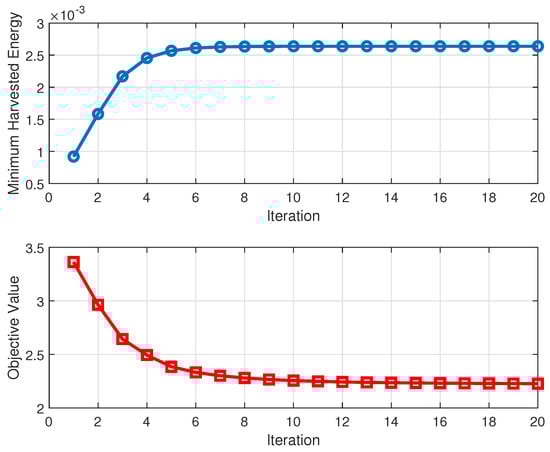 For the max–min problem in SWIPT, by introducing the auxiliary variable , the original problem can be equivalently rewritten as