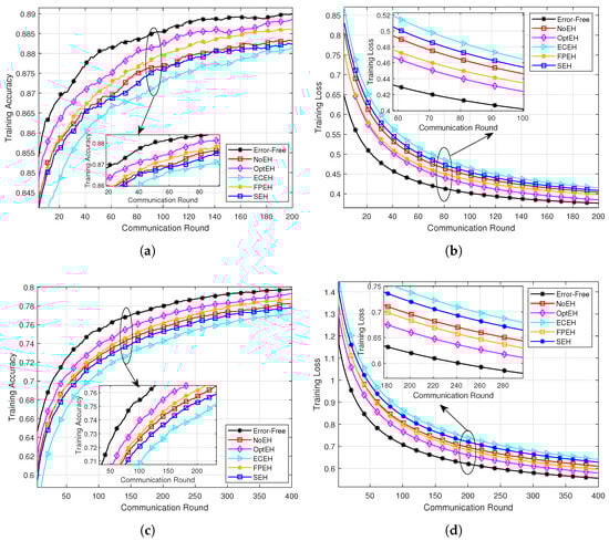 As shown in Figure 4a,b, we further analyze the impact of varying numbers of BS antennas on the training performance of the proposed method. The results indicate that, as the number of receiving antennas at the BS increases, the learning performance of all schemes improves significantly. This enhancement is primarily attributed to the additional multiplexing gain provided via the BS antennas, which effectively strengthens the signal reception capacity and reduces transmission distortion during the model update process. Notably, compared to other baseline methods, the proposed optimization framework demonstrates a more pronounced performance advantage as the number of BS antennas increases.