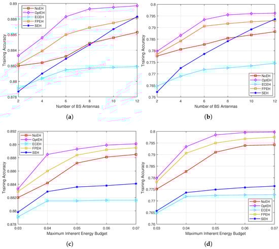 Performance comparison between the proposed algorithm and the baseline schemes across both datasets under different numbers of BS antennas and maximum inherent energy budget. (a,b) illustrate the testing accuracy on both datasets as the number of BS antennas changes, while (c,d) show the testing accuracy on both datasets under different maximum inherent energy budgets.