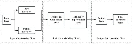 The framework of the improved SBM model for analyzing green innovation efficiency using asymmetric data is shown in Figure 1. Three-stage efficiency evaluation framework based on the SBM model. The framework consists of three phases: (1) Input Construction Phase, where input and output indicators are defined; (2) Efficiency Modeling Phase, where the traditional SBM model computes preliminary scores and the efficiency improvement layer refines them; and (3) Output Interpretation Phase, where results are aggregated and the final efficiency value is obtained. Arrows denote the logical flow and transformation of data across stages.