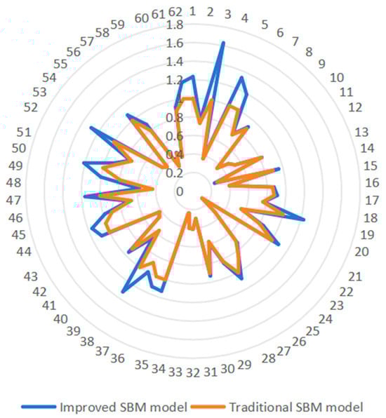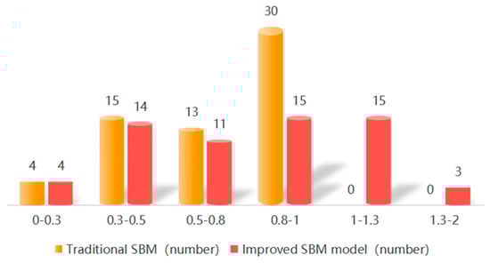 Distribution structure of efficiency values under the traditional SBM model and the improved SBM model.