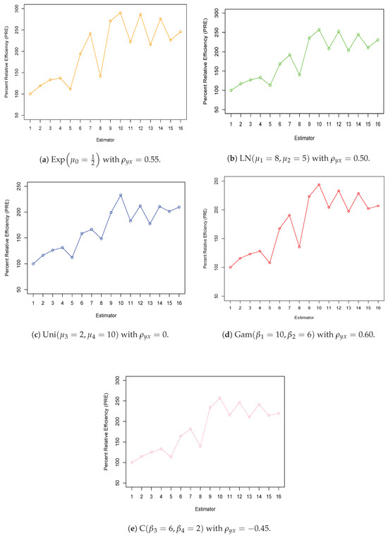 - The datasets used in Figure 2 come from different sources, and they share structural similarities such as skewness and moderate to strong correlation between study and auxiliary variables. This explains the similar trends in PRE values across plots, reflecting the robustness of the proposed estimators under such conditions. The sharp drop in PRE from estimator 4 to 5 is due to the structural difference in their exponential forms. Estimator reduces the effect of median differences, while may increase variability, especially when and differ, making it less stable. Among all existing and proposed estimators, consistently achieves the highest PRE values and is recommended for practical use.