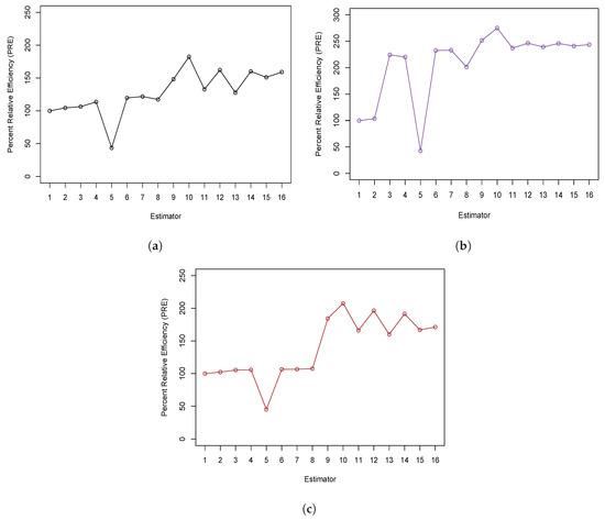 Figure 2. A graphical illustration of the outcomes based on data obtained from three real population datasets. The figure compares 16 estimators: the first 8 represent existing methods ( to ), while the remaining 8 correspond to the proposed estimators ( to ). (a) Data-1: (Source: [13]). (b) Data-2: (Source: [34]). (c) Data-3: (Source: [35]). - Although different distributions and correlation levels were used, Figure 1 shows a similar trend across all plots. This consistency highlights the robustness of the proposed estimators, particularly , which are designed using transformation techniques and nontraditional auxiliary measures. The drop in PRE from estimator 7 to 8 is due to the higher variability in ’s nonlinear form. Each plot includes 16 estimators: the first 8 are existing methods ( to ) and the last 8 are proposed estimators ( to ). Among them, , , and achieve the highest PRE values.