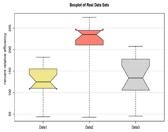 Figure 4. A boxplot representation of the percent relative efficiency (PRE) values for different estimators across real datasets.