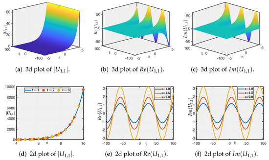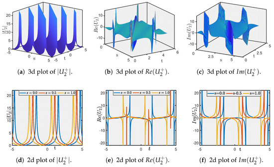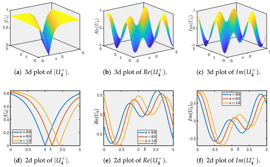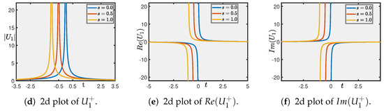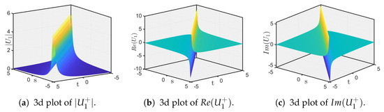 - In Figure 1, we present the solution from Equation (40) using the parameter set . This solution describes a bright soliton, with its absolute value shown in Figure 1a and its real and imaginary components depicted in Figure 1b,c.