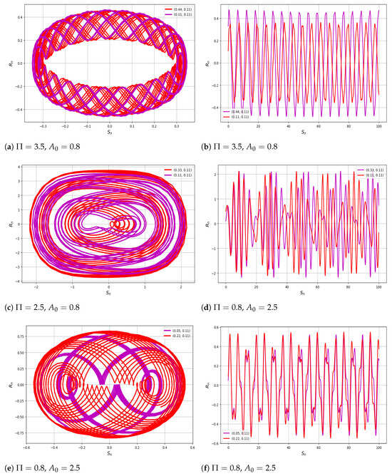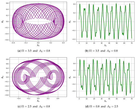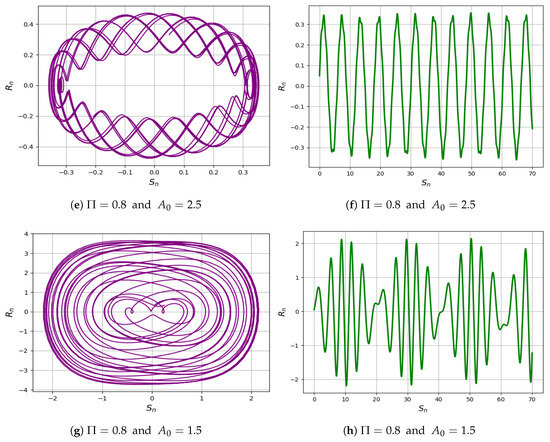 and denote the amplitude and frequency of system (46), respectively. By assigning the parameters and , the two-dimensional and time analysis phase portraits of the system (46) are illustrated in Figure 5a–h.
