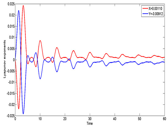 The Lyapunov exponent constitutes a pivotal metric for assessing system dynamics, particularly within the realms of chaotic and dynamic systems [43,44]. It quantifies the rate at which adjacent trajectories diverge from each other; a positive Lyapunov exponent signifies chaotic behavior, whereas a negative exponent reflects stability [45,46]. This property is vital for the identification of chaotic phenomena and the investigation of the stability associated with equilibrium points or periodic orbits [47,48]. Moreover, the Lyapunov exponent serves as a determinant of a system’s predictability; positive values indicate a sensitive dependence on initial conditions, culminating in unpredictable long-term behavior [49,50]. Its relevance across diverse fields, including engineering, economics [50,51], and meteorology [52,53], underscores the significance of understanding complex systems [54,55]. We calculate the Lyapunov exponent using , , , , and with the initial condition . The maximal Lyapunov exponent has been determined to be 0.00110, signifying that one of the Lyapunov exponent values is indeed positive [56], thereby corroborating the quasi-periodic dynamics, as illustrated in Figure 6.