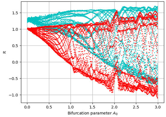Confirm of the quasi-periodic behavior of system (46) under the conditions , , and , illustrated using the bifurcation diagram. The trajectories starting from initial conditions (0.45, 0.01, 0.05) are shown in red dots, and (0.75, 0.01, 0.05) in cyan dots.