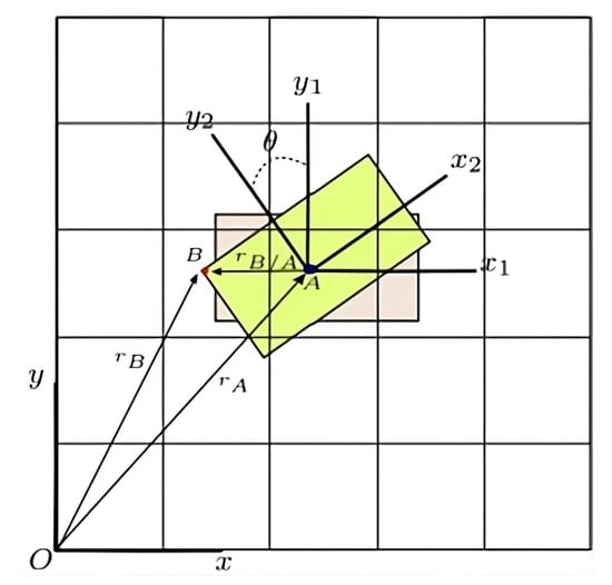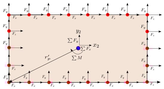 The orthogonal system has a single rotational degree of freedom about the z-axis defined from the structural motion equation (Equation (8)) for the position and angular velocity of the centroid, which can be represented by and . This system behaves as a rigid body, which implies that the distance between two points within it remains unchanged during the motion. The position of the Lagrangian point on the moving axis is defined as for p = 1 to p = Np, where Np represents the total number of Lagrangian points. Since the system is plane, the Lagrangian forces at each point are given by , as presented in Figure 4. Similarly, Lagrangian forces can be defined as