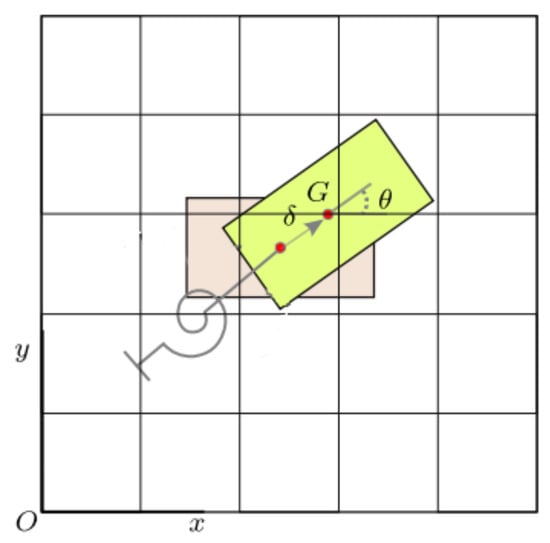 In this study, the structural model consists of a rectangular cylinder subjected to kinematic motion restricted to the plane, with its center of mass (G) constrained to move only along the x- and y-directions. As a result, the system has a single rotational degree of freedom, , about the z-direction, as illustrated in Figure 2. The interaction forces are determined using the direct forcing method. Although the detailed derivations are omitted here for brevity, comprehensive explanations can be found in [,,].