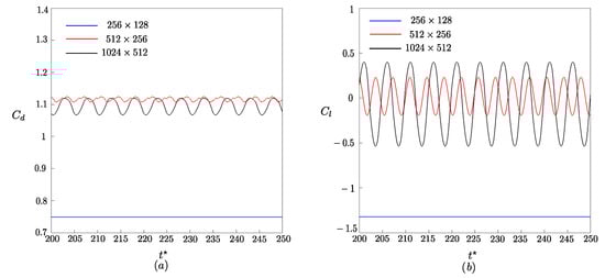 Table 3 presents the Strouhal numbers (); f is the vortex shedding frequency (Hz) for Re = 250. It can be observed that the 256 × 128 mesh cannot be used to represent the coefficients, whereas the 512 × 256 and 1024 × 512 meshes achieved values that are closer to those reported in the literature. The Strouhal number reported by Nakamura et al. [] differed by 0.68%, i.e., lower than 1%, compared to this study for the 1024 × 512 mesh. Comparing the Strouhal number obtained by Lindquist [], the difference was 5% and 0.7% for 1024 × 512 and 512 × 256 meshes, respectively.